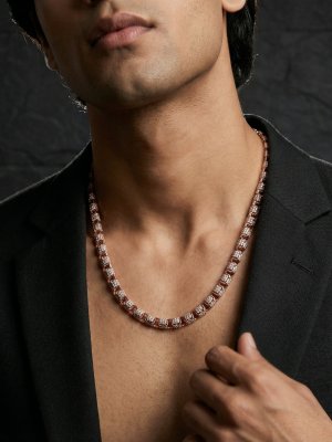 Command attention with the Axiom Pavé Block Chain, a monument to geometric luxury. This heavy-duty men's chain is constructed from solid, repeating 18K rose gold rectangular blocks, creating a bold, architectural silhouette that exudes power and confidence. Each block is meticulously hand-set with a tight, full grid of brilliant-cut pavé stones (available in cubic zirconia or diamonds), creating continuous, high-intensity sparkle along the entire length of the chain. These block links are joined by polished rose gold connecting pins, adding structural detail and allowing for a flexible, comfortable drape. This is not just an accessory; it is a defining piece for a signature look, perfect for a modern tastemaker who demands uncompromising quality and visibility.