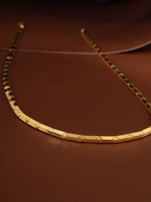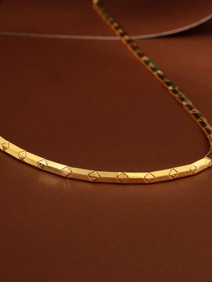 Experience the pinnacle of streamlined luxury with the Diamond-Back Liquid Chain. This unisex 18K gold necklace is masterfully engineered to mimic the fluid movement of liquid gold while maintaining a bold, structural presence. The flat, high-polish surface is precision-etched with a rhythmic series of diamond-shaped facets that catch and scatter light with every slight movement. Its semi-rigid, low-profile design allows it to rest perfectly flat against the skin, offering a sleek and modern alternative to traditional links. Whether worn as a sharp, minimalist statement or tucked under a collar for a hint of architectural shimmer, this chain is a definitive signature of 21st-century elegance.
