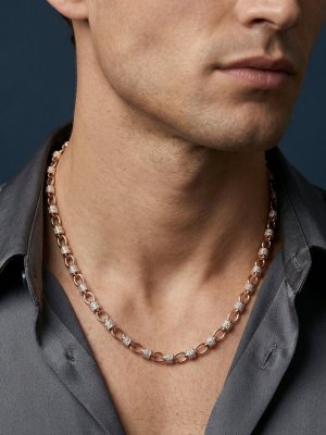 Step into the light with the Luminous Orbit Chain, a unisex masterpiece designed for the contemporary tastemaker. This 18K rose gold necklace features a rhythmic, alternating sequence of sleek polished oval links and diamond-faceted barrel stations.