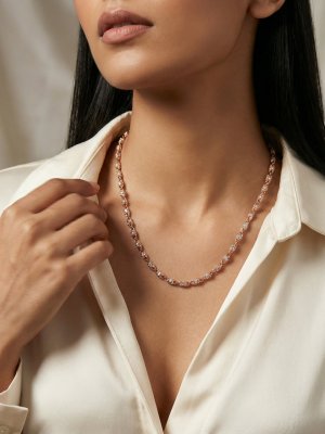 Elegant, refined, and effortlessly versatile, the Stellar Glint Chain is designed for those who find power in subtlety. This unisex necklace features a delicate series of 18K rose gold links, each meticulously hand-set with micro-pavé stones to create a seamless stream of radiance. Its slender profile makes it a perfect choice for daily wear, offering a sophisticated touch of luxury that never feels overdone. Whether tucked under a collar for a hint of sparkle or layered with bolder pieces to create a high-fashion textured look, this chain is a fundamental addition to any modern jewelry collection.